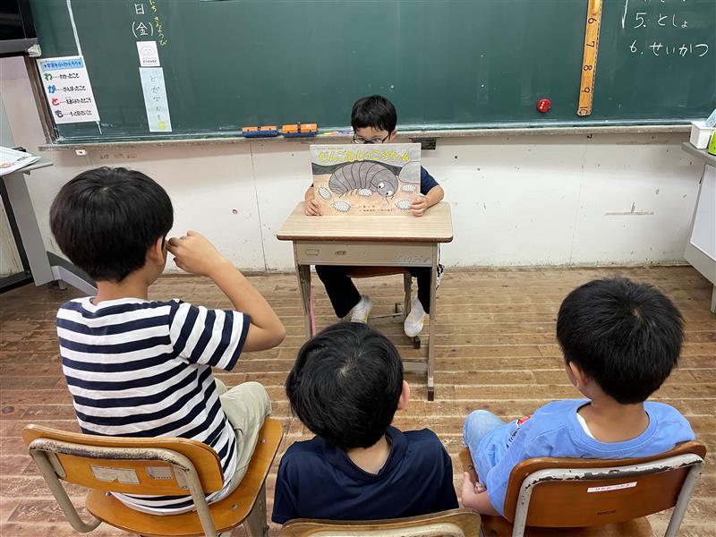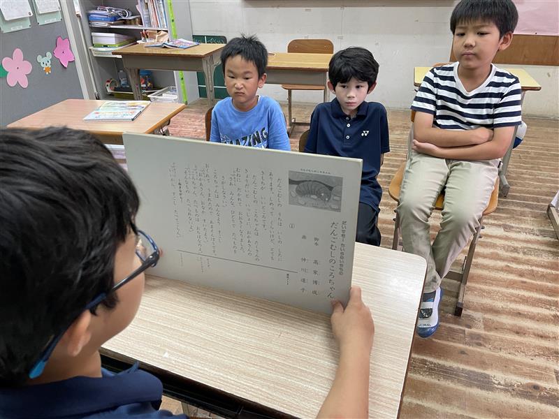 大自然の美しさを感じます。図書の時間に「絵本の読み聞かせ」を1年生のために、2・3年生がしてくれました。