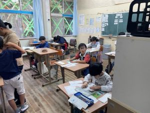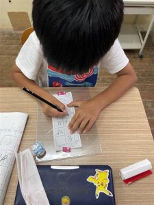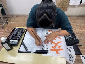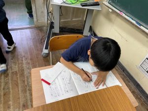 こちらは、毛筆教室です。五年 名前を丁寧に書いています。
