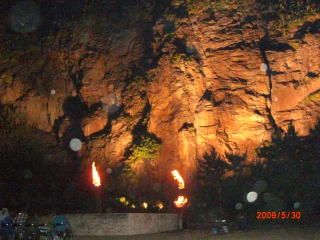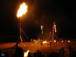 8月15日に行われる俊寛の霊を慰めるお祭りです。 大名竹を組んで作った高さ12mと8mの大きなたいまつのてっぺんに向けて,火のついた長さ30cmの松のたいまつを投げ入れます。 最初に火をつけた人には幸運が訪れると言われています。 この柱松の火は,海を越えて屋久島からも見えるそうです。 |