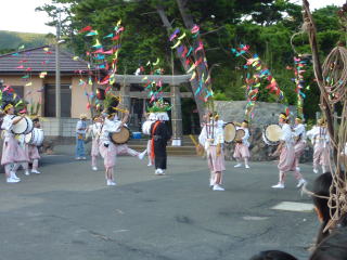 旧暦8月1・2日に行われる男性のお祭りです。 豊臣秀吉の朝鮮出兵に参加した島の3人に対する凱旋祝いとされています。 胸には太鼓,背中には矢旗をつけて,2日に分けて踊ります。 このときメンドンと呼ばれる鬼の面をつけ,全身にカヤノミをまとった男子が暴れ回ります。 踊りには男子中学生が参加し,メンドンには小学生も参加します。 |