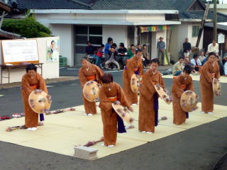 10月下旬に行われる女性のお祭りです。 由来は疱瘡よけの踊りであると言われています。 踊りは「花の大阪」「祭文弊」「思い立ち」「疱瘡踊り」の大きく4つに分かれ,2日間踊ります。 それぞれの踊りで使う道具(扇子,杖)や着物の色は異なります。 女子中学生も踊り子として参加します。 |