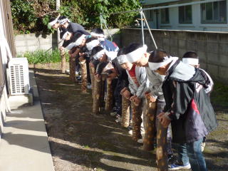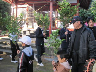 1月7日に行われる行事です。 朝,中学生以下の男子が鉢巻きをして,棒を持ってまわります。 その家族の無病息災を願って,文句を唱えながら棒で地面を突いて悪霊を追い払います。 |