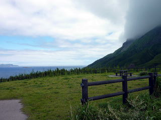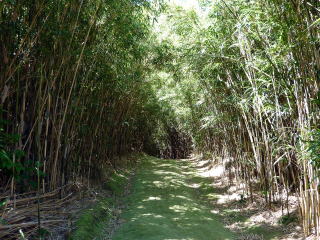 硫黄島の北へ向かう途中,矢筈岳の麓の大名竹の林にひとすじの緑の細道が現れます。 それが俊寛堂への入り口です。 その細道はこけの絨毯に覆われ,木漏れ日が射す光景はとても幻想的です。 |