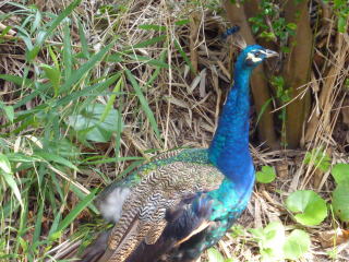 以前,島の施設で飼っていたものが野生化し,今では島民をこえるほどの 数になっているといわれています。 学校の校庭で多いときは一度に7羽ほど見かけることもあります。 1日に白いクジャクを2回見ると,幸運が訪れるという話もあります。 |