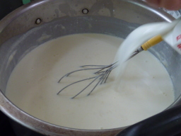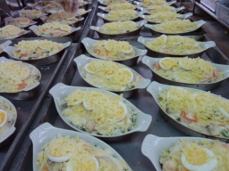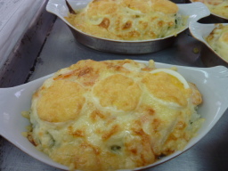 | 小麦粉を炒めホワイトルーを作り,1人分ずつオーブンで焼き上げます。 こんなグラタン皿もちゃんと全校児童生徒、職員分あるのですよ! |