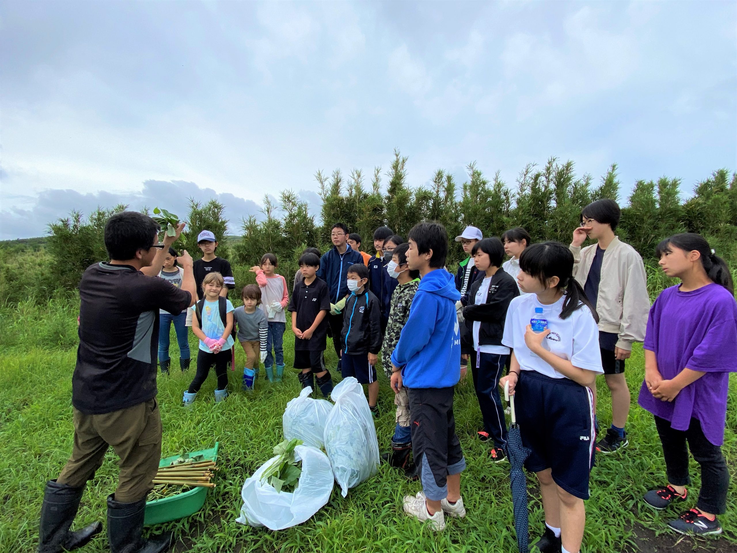 学級園で苗を育てて,今日はいよいよ畑に植えます。まず,植え方を教わりましょう。