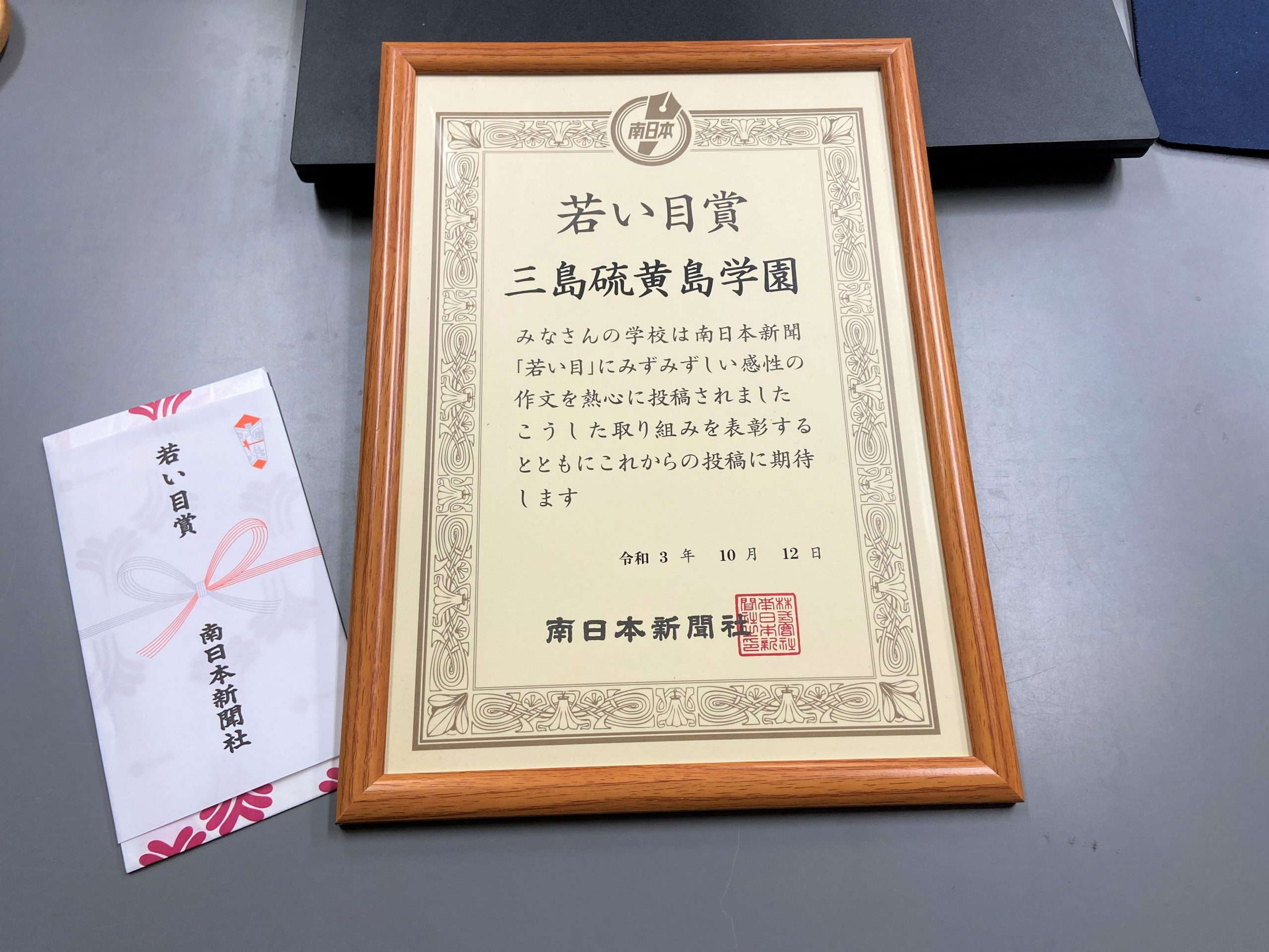 南日本新聞より「9月の若い目賞」の賞状が届きました。