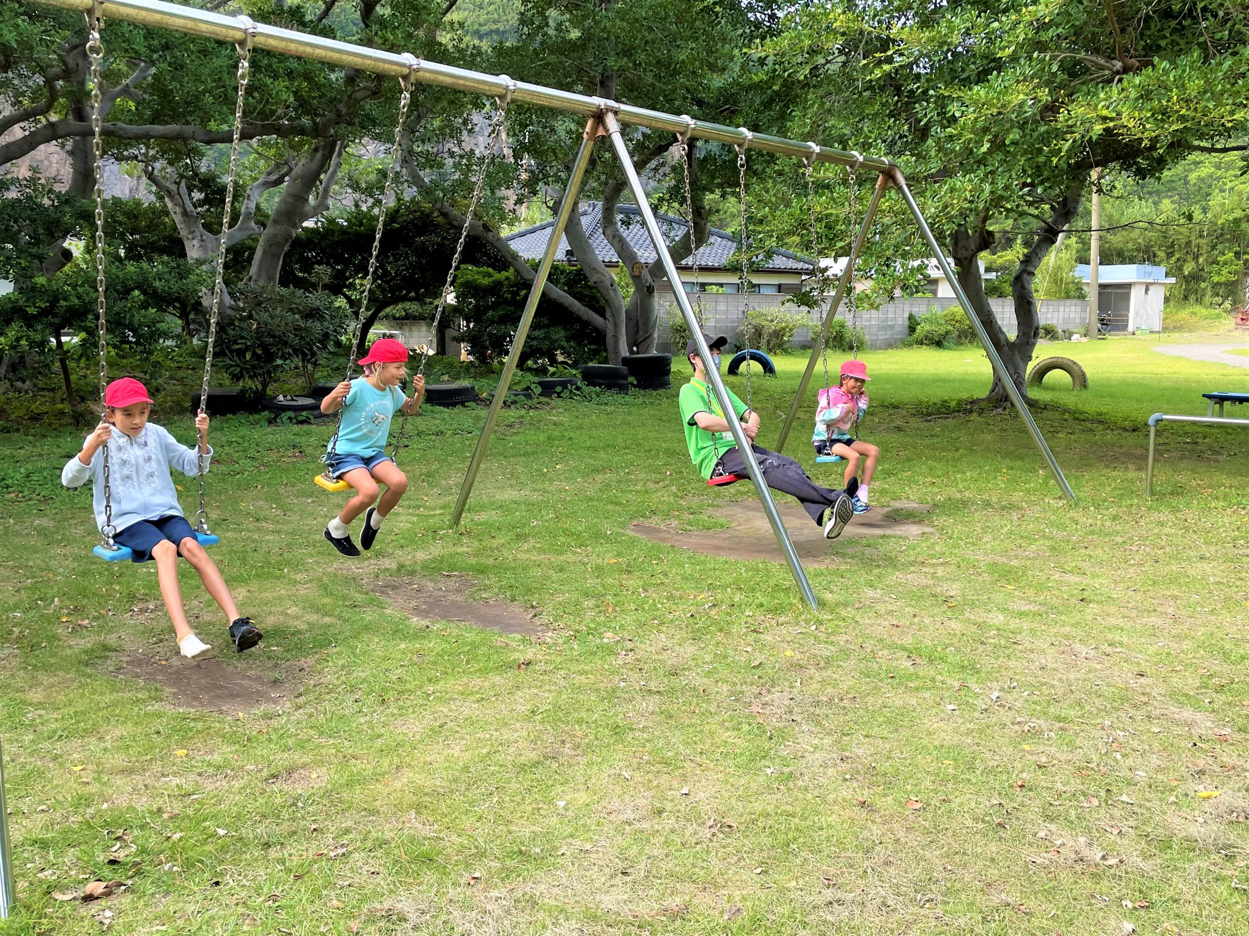 こちらは,低学年の子ども達とブランコ遊び。くつ飛ばしをしましょう!