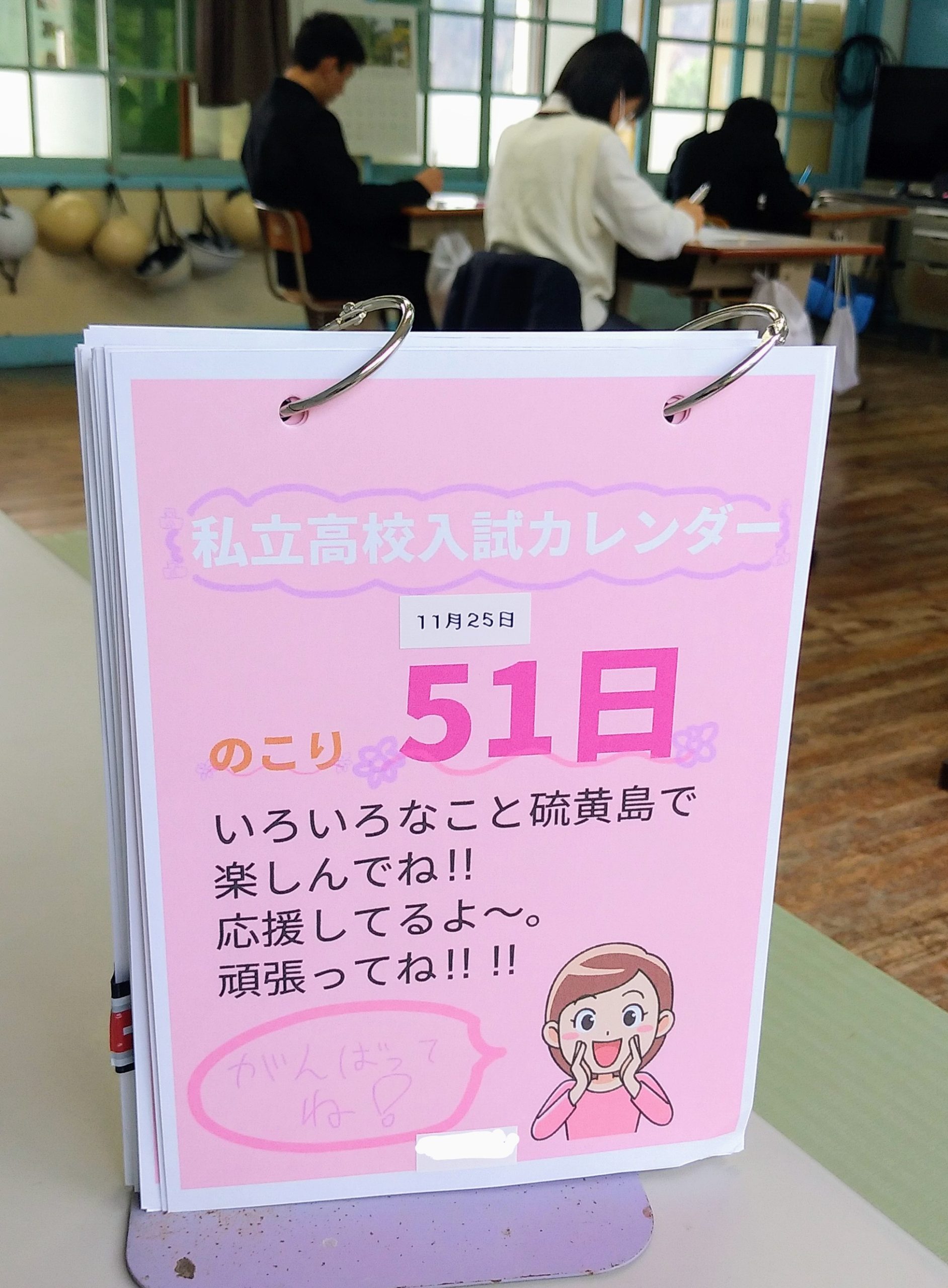 9年生教室には、技術の時間に作ったという、7,8年生の私立高校入試カウントダウンカレンダーが置いてありました。今日は後51日。後輩のメッセージを胸に、頑張れ、9年生!