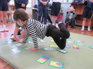 読み手に合わせてことわざを言いながら,全身で札を取る二人です。