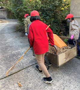 ・意外と落ち葉がたくさんあり,大変でした。リヤカー3回分の落ち葉を集めることができてよかったです。見違える道を見て達成感を覚えました。地域の人たちのために,何かできて心がスッキリしました。