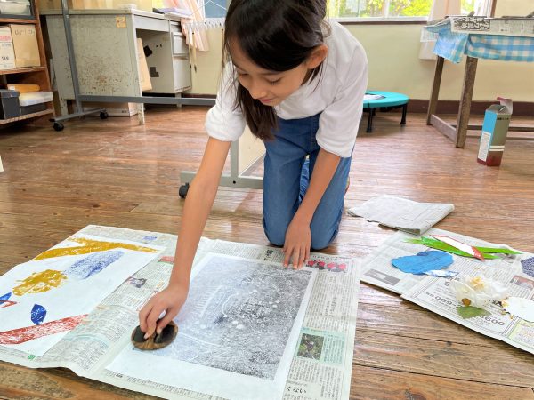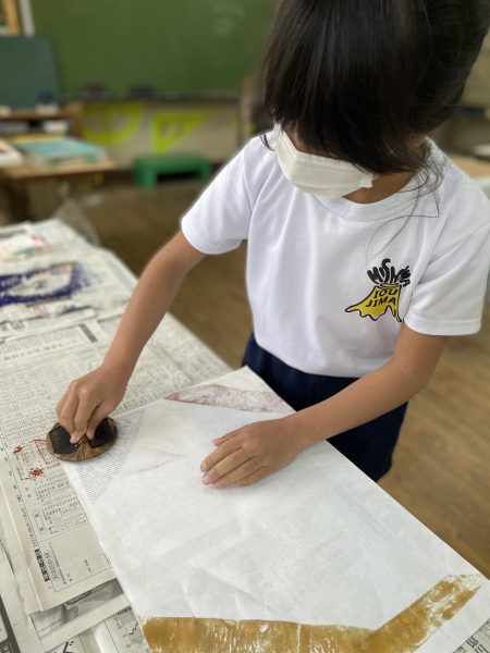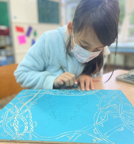 4年生は木版画。テーマは「不思議な花」です。板に絵を描いて彫っていきます。三角刀と丸刀を使い分けて彫りました。大きな花を守っている「いばらのつる」の重なりも表現できました。