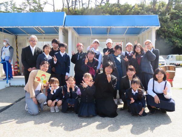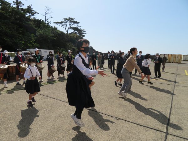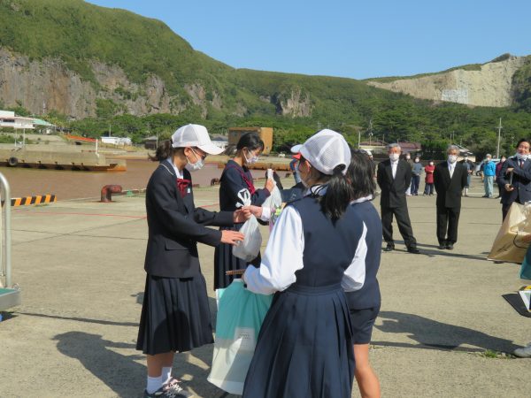 式の後、急いで港に向かい島を離れる後期生2名のお別れセレモニーが行われました。