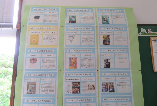 図書室には子どもたちのおすすめの本がずらりと掲示してあります。