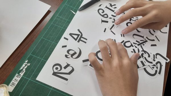 配布された資料に書かれた文字をを自由に切り取って,オリジナルの宇宙人の文字を作ることができました。