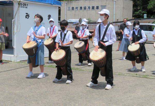 三島硫黄島学園では,フェリーの入港・出校に合わせて,子どもたちがジャンベでお出迎え・お見送りをします。