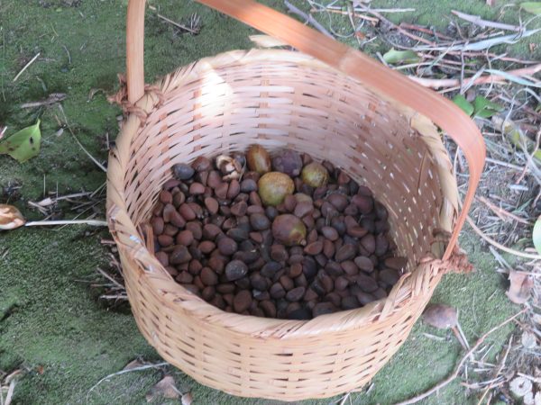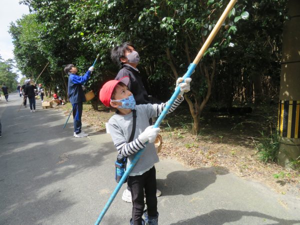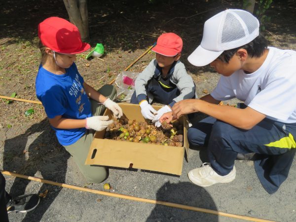 地域の方に取り方を教えていただき,保護者の方にも手伝っていただきながら,たくさんの実を拾うことができました。
