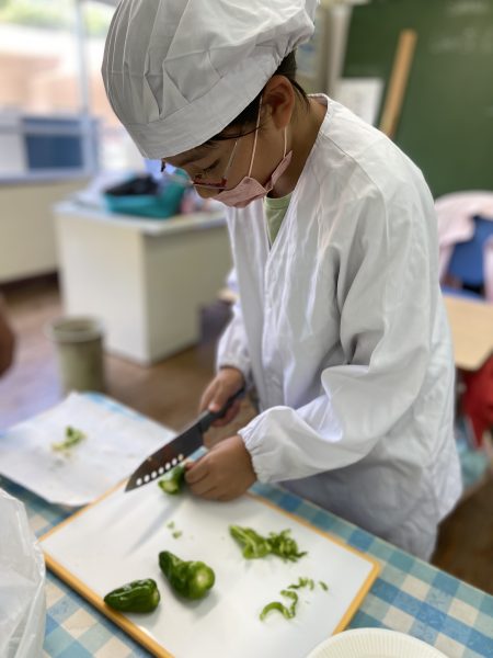 2度の台風に襲われながらも、なんとか生き抜いた学級園のなすと3年生が理科で育てていたピーマンを使って、今日はクッキングをしました!