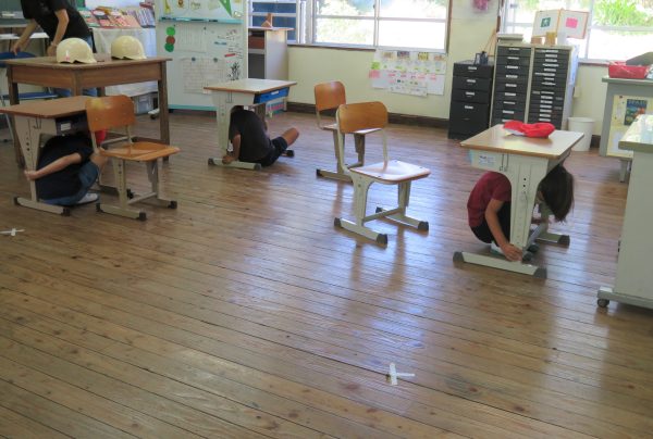 「大きな地震が発生しました。地震がおさまるまでは、机の下に隠れてください。」