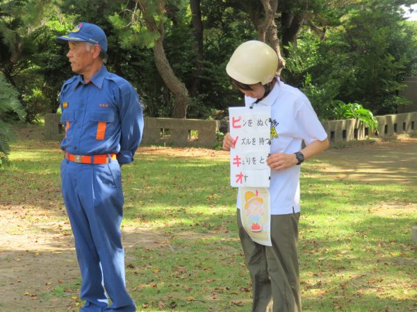 地区の消防分団長さんから今日の避難訓練についての講評をいただき、消火器訓練を行いました。