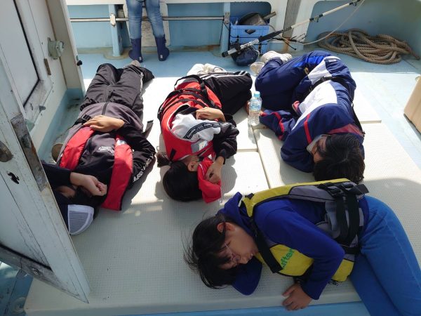 少し波にうねりがあったため、船酔いする子たちも、、、