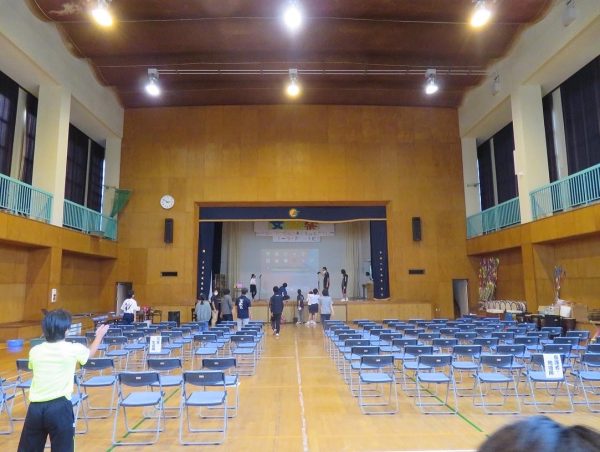 体育館を掃除したり、いすを運んだり、看板を取り付けたり、