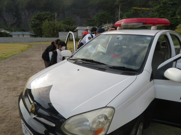 鹿児島中央警察署の地域課の課長さんが硫黄島に来島し,子どもたちに警察の仕事について講話をしてくださいました。