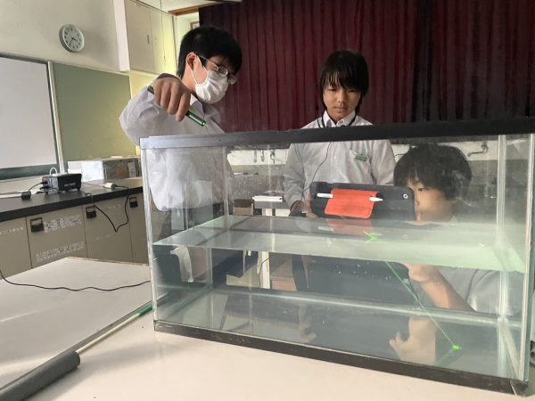 普段とは違う環境ではありましたが,自分たちで実験のプランを立て,水の中での光の道筋を実験することができました。