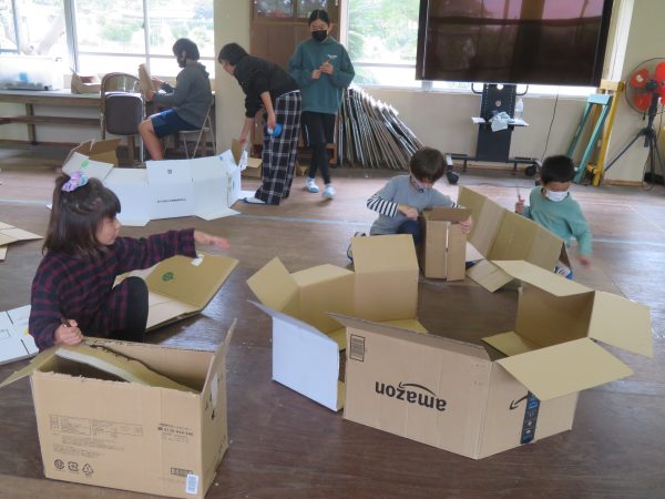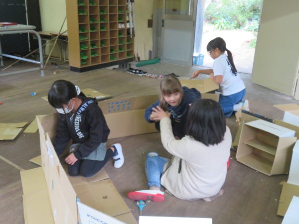 前期生のクラブ活動は、段ボール工作でした。迷路を作る予定でしたが、迷路を作るには段ボールが足りなそう・・・