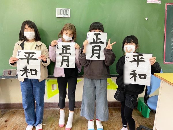 3年生は「正月」を書きました。2文字書くのは初めてなので、文字のバランスを意識して一筆一筆丁寧に書きました。
