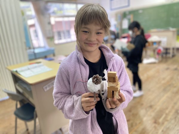 豆電球を入れるところは、張り子にして作り、学校の周りで拾った枝や松ぼっくりを組み合わせて作りました。
