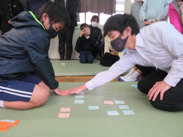 かるた大会を終えた、1・2年生、先生たち、応援にかけつけた保護者の方に応援されながら対決です。