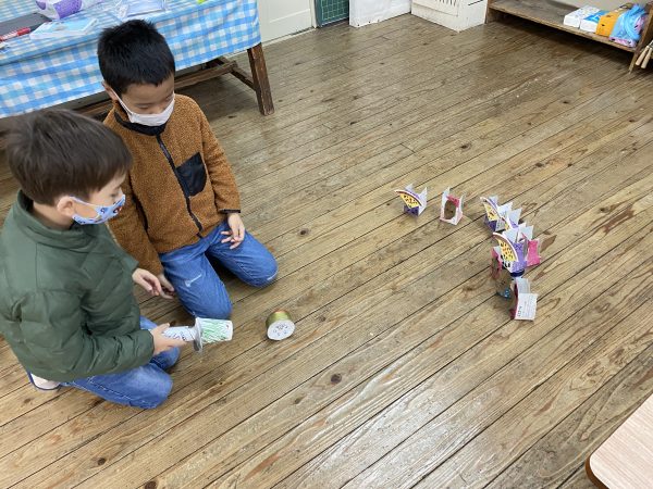 2人とも思い思いのおもちゃを作り、完成したおもちゃをお互いで楽しんでいました✨
