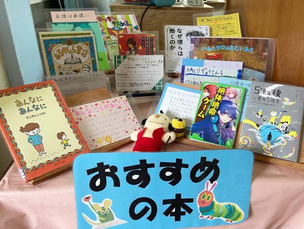 県立図書館の先生といっしょに作ったポップを前期生のおすすめの本コーナーとして並べました。