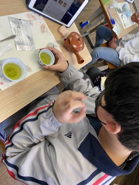 ただ急須にお茶の葉を入れてお湯を注ぐのではなく,急須にお湯を入れるときにも,お湯の温度に注意しながら急須に入れました。急須から湯呑に注ぐときも,一回で注ぐのではなく,何回かに分けてお茶を注ぐということなどたくさんのことを教えていただきました。