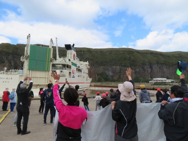 島立ちのセレモニーを行い、在校生、島の方々に見守られながら新天地に向けて出発です。