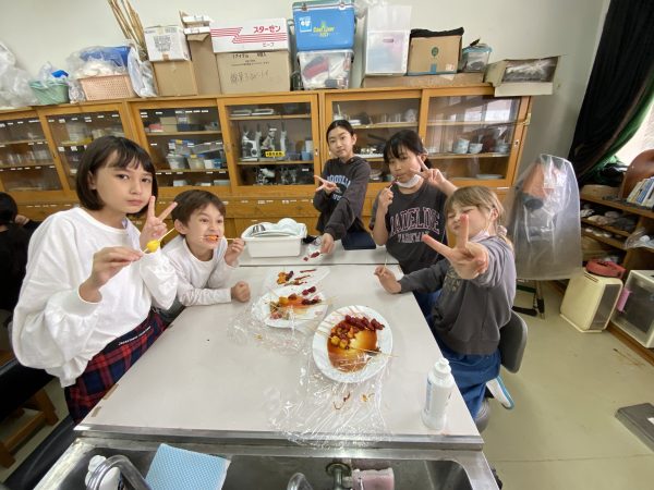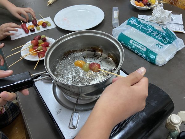 前期生、今年度最後のクラブ活動は、6年生リクエストのフルーツあめ作りでした。