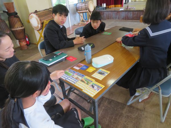 今回は、SDGsカードゲームを使って、SDGsについて学習です。前半では、グループの到達目標に向けてカードを集めたり、お金を集めていました。