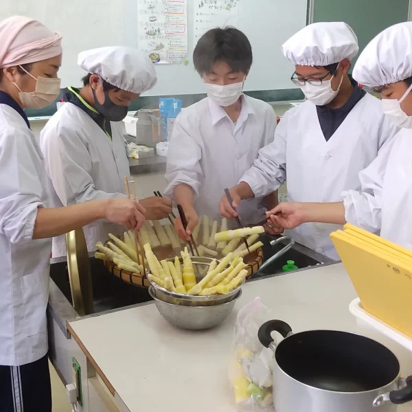 家庭科の授業で、三島村の特産物、大名竹を使った塩漬けを作りました。