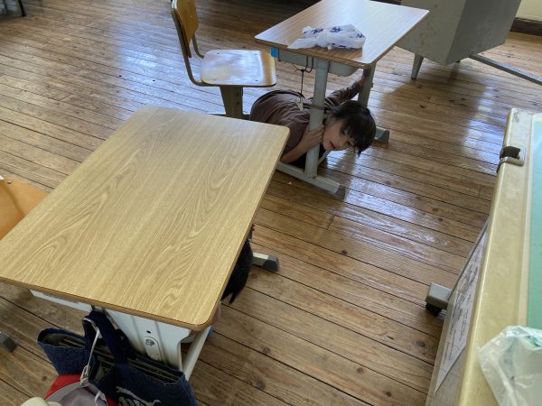地震発生の放送を聞き、机の下に隠れます。