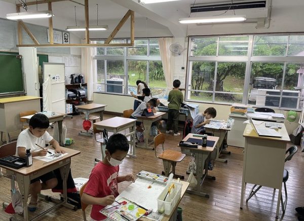 1〜8年生は小さい灯篭、9年生は一番大きな灯篭の絵を描き、色塗りを行いました。