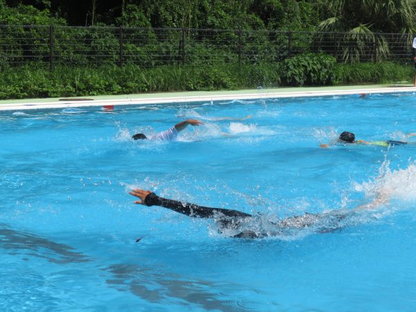 距離泳では、1〜9年生、地域の方が参加し、みんな全力で泳ぎました。