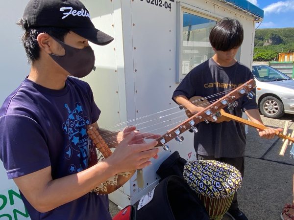 お手製の楽器を手に、帰ってくるとジャンベ演奏にも参加です。