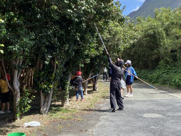 かぎになっている棒をうまく使い、木になっている実を落とします。また、落ちている椿の実を拾っていきます。
