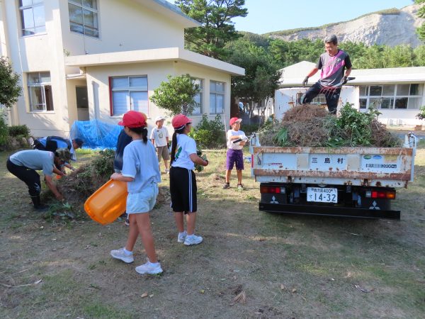 今回は、道路、校庭の斜面、校舎周辺をきれいにしました。