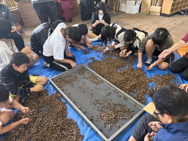 収穫し、乾燥させた椿の実を出荷に向けて選別しました。