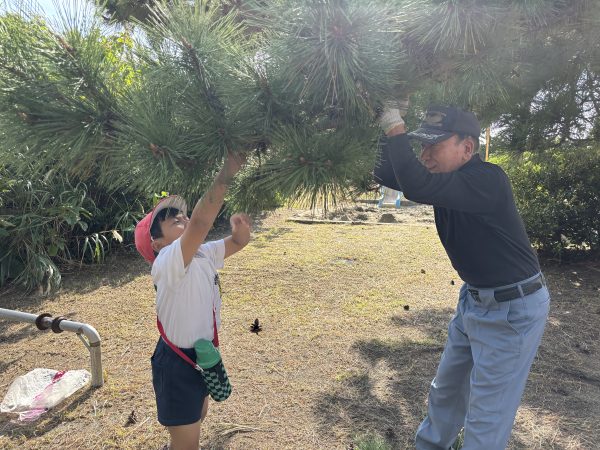 地区内を探検していると、地域の方が木を引っ張ってくださってたくさんの松ぼっくりを集めることができました。