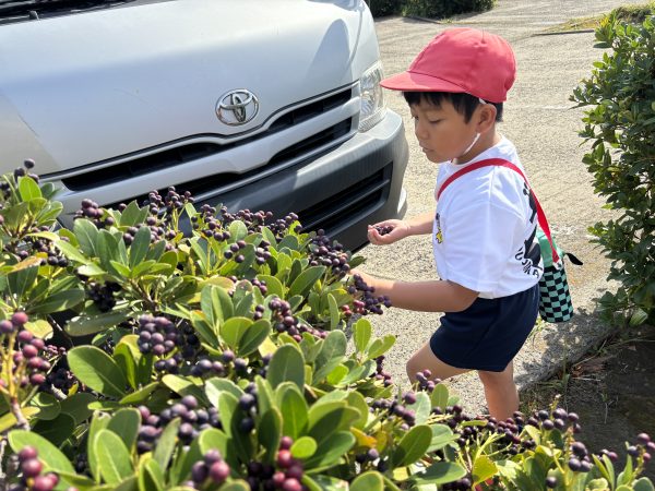 校庭では、松ぼっくり、椿の実、落ち葉を見つけました。