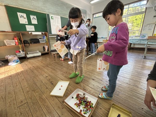 的当てゲームとどんぐり釣りのゲームで遊んでもらい、松ぼっくりのプレゼントを渡しました。