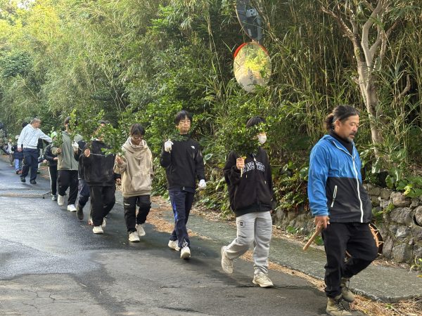 岳之神神社から枝に神様を乗せ、熊野神社までお連れします。